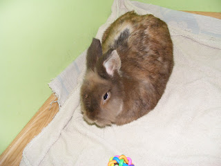 Przetrzymywany małym akwarium jak na 2 duże króliki (wcześniej jeszcze rodzeństwo). Gdy miał 9 tygodni, był cały rudy oprócz brzuszka (biały). Teraz zamiast rudego jest ciemny brąz. Na starość ma problemy ze skórą i oczami.